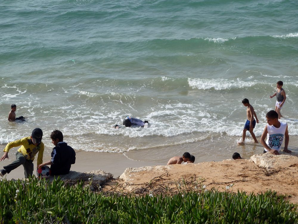 Boys play in the surf at the beach, one kneeling with his head underwater