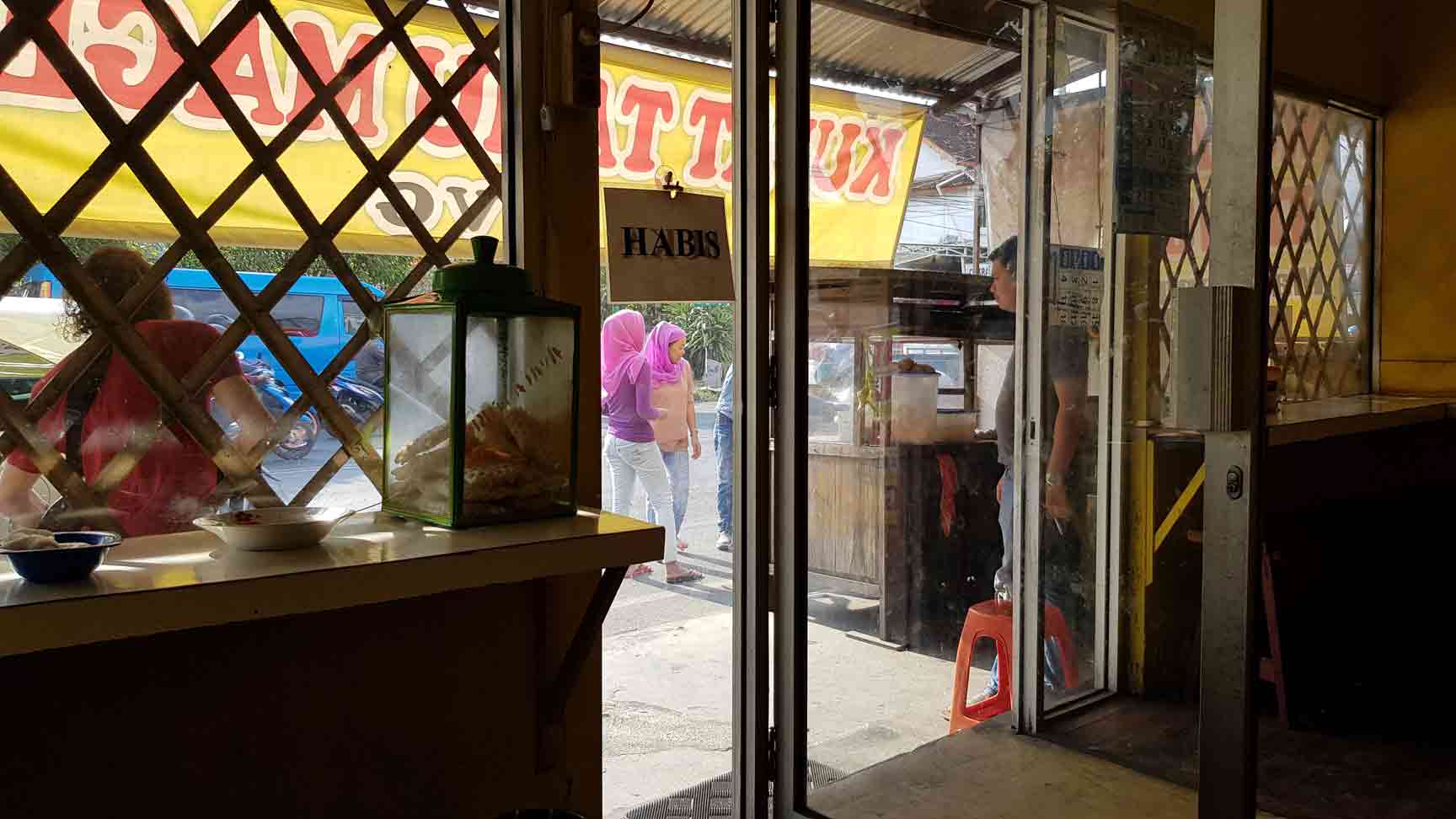 Women in pink hijab seen through the door from the interior of a warung.