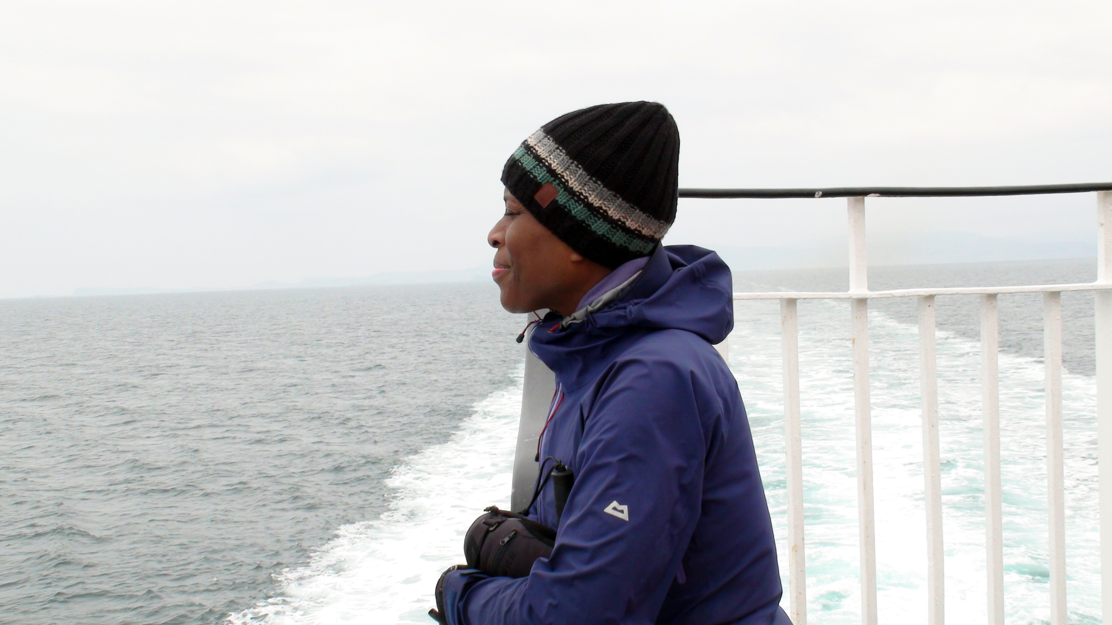 A woman leans against the rail of a ferry boat with the boat's wake visible behind her.