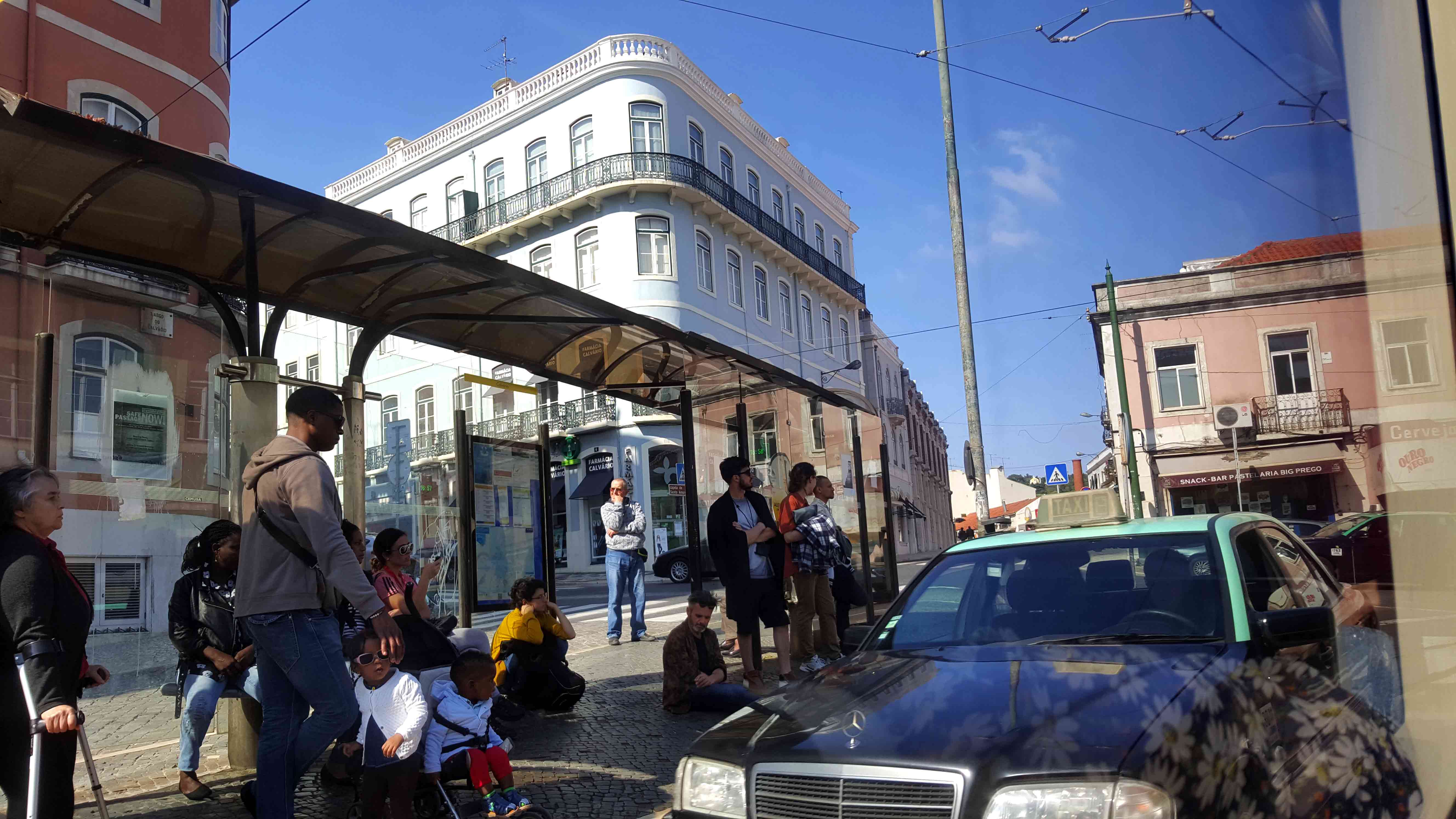 People gathered at a bus stop beside old European buildings and a passing car