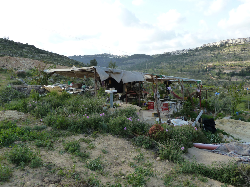 An open structure dwelling sits in the midst of a hilly landscape with settlements in the distance